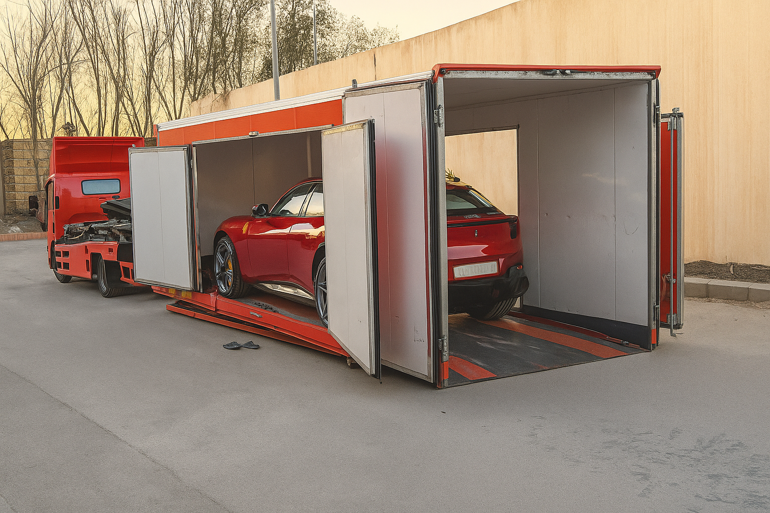 السطحة المغلقة توفر حماية كاملة للسيارة أثناء النقل، وتحميها من الغبار، المطر، الشمس، والخدوش، مما يجعلها الخيار الأفضل لنقل السيارات الفاخرة والرياضية.